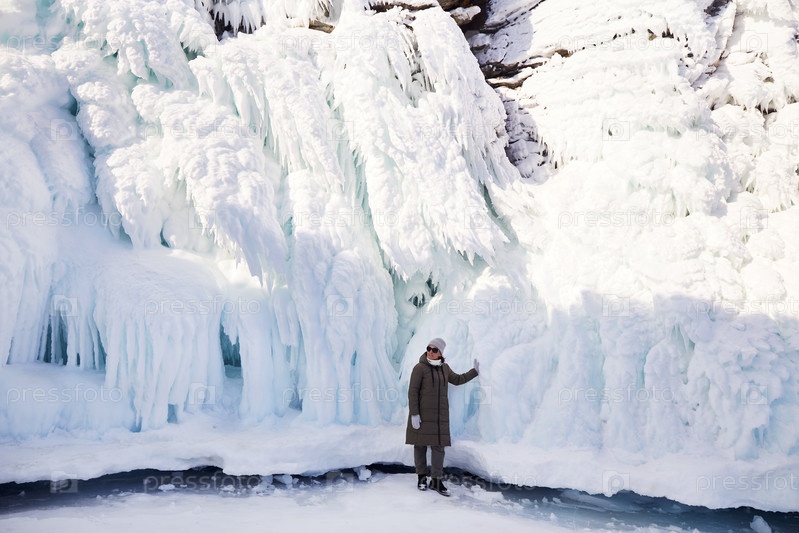 Женщина смотрит на огромные сосульки на скалах