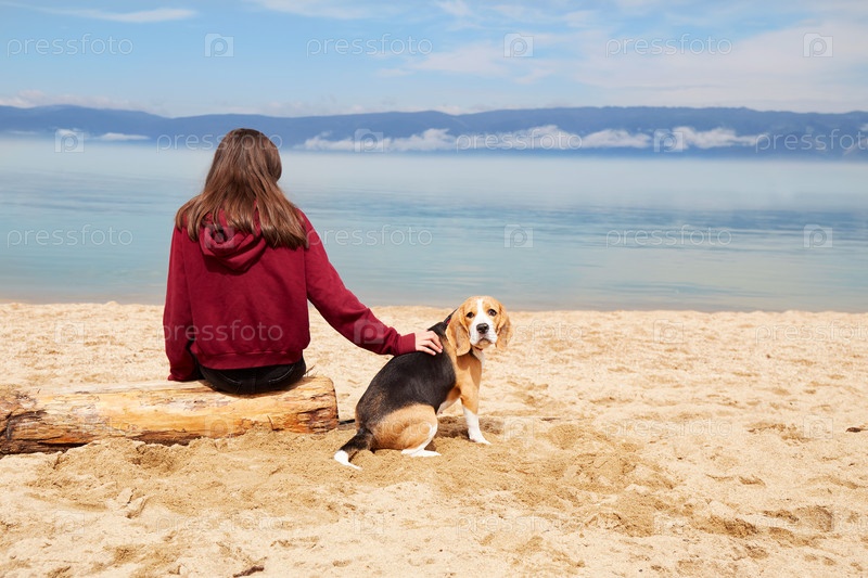 Девушка сидит на бревне на песчаном пляже со своей собакой бигль