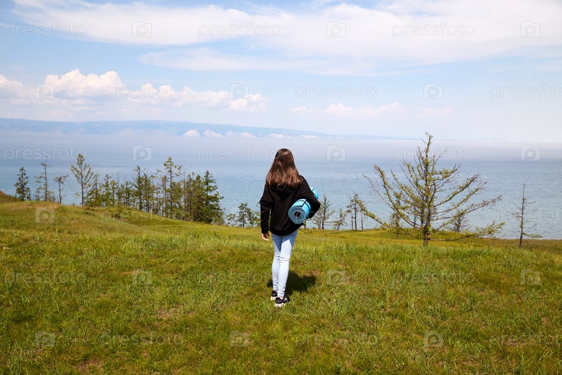 Маленькая девочка с ковриком для йоги любуется красивым пейзажем
