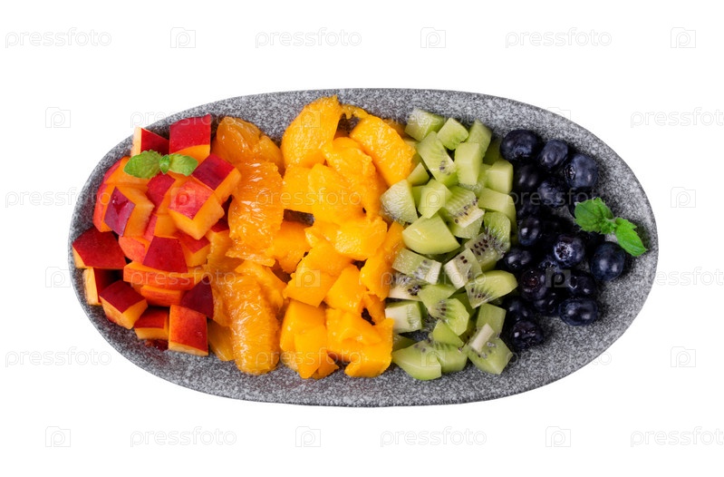 Ассорти из нарезанных фруктов и ягод рядами, напоминающими цвета радуги на тарелке, изолированной на белом. Нектарин, апельсин, манго, киви и черника