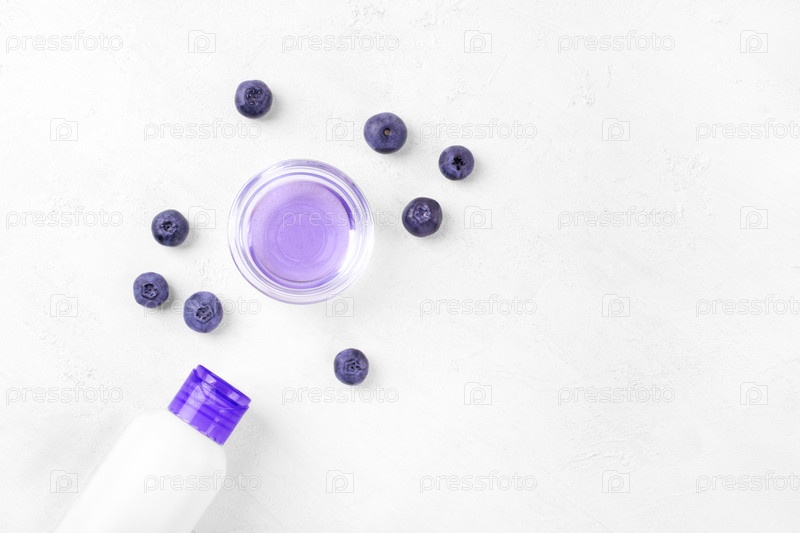 Гель для душа с ароматом черники во флаконе. Немаркированный продукт по уходу за телом с натуральными ингредиентами. Вид сверху. Копировать пространство