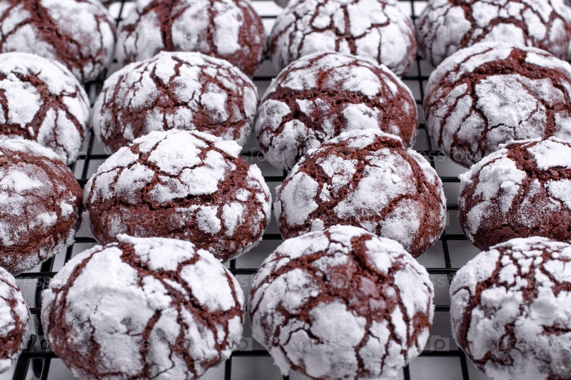 Шоколадное печенье морщинками рядами на охлаждающей стойке. Продовольственный фон