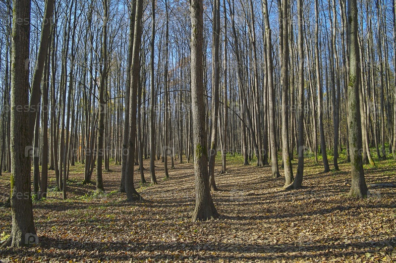 Полоски света и тени на опавшей листве на тропинке в осеннем лесу. Середина октября. Битцевский лесопарк, Москва, Россия
