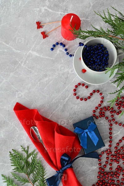 Счастливого Рождества, счастливого нового года. Композиция из веток натуральной елки и красных шаров, украшение на фоне светлых деревянных досок. Вид сверху. Место для вашего текста