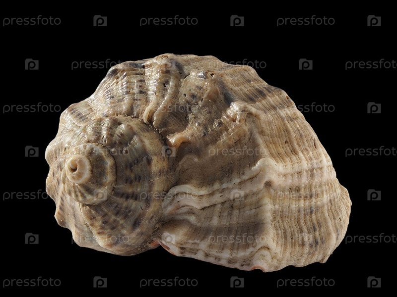 Рапаны, изолированные на черном фоне. Макрофотография. Красивая раковина в крупном плане. Рапана род хищных морских брюхоногих переднеспинок семейства колючих (Muricidae)