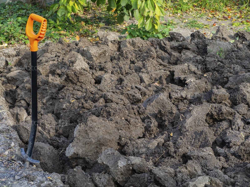 Лопата в выкопанной земле. Металлическая лопата застряла в черноземной земле на огороде в осеннем саду во время сельскохозяйственных работ. Копание грядок
