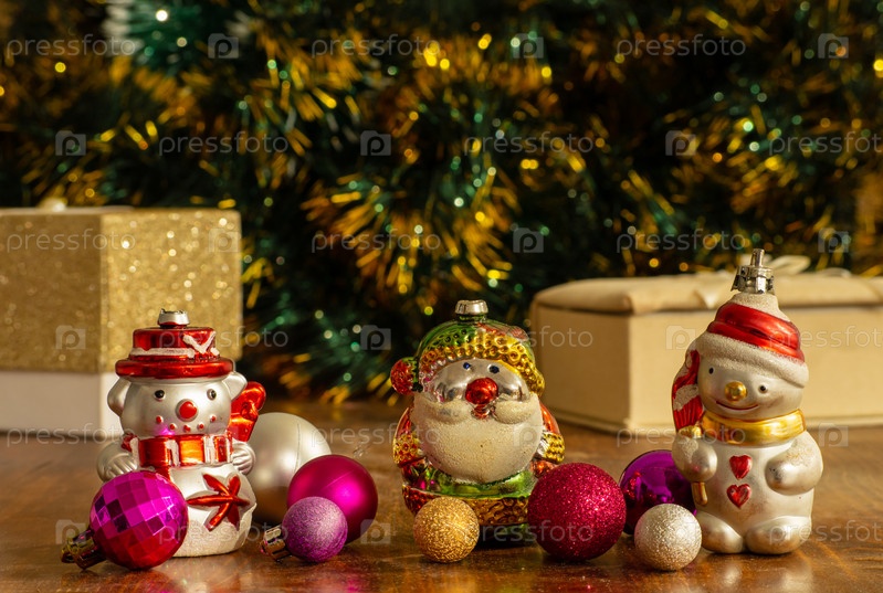 Рождественские украшения-игрушки (снеговики, Дед Мороз и воздушные шары) лежат на деревянном столе. Коробки с подарками и зеленая мишура с желтыми кончиками видны на расфокусированном фоне