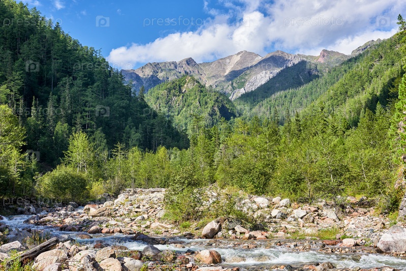Поток в горной долине в сибирских горах. Восточные Саяны. Бурятия. Россия