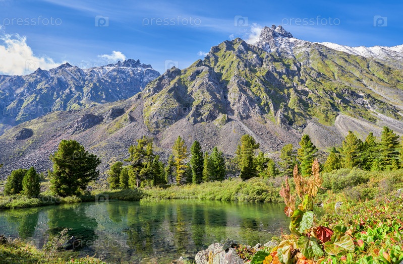 Небольшое озеро у подножия горной вершины. Ревень с колосьями семян на переднем плане. Август. Восточный Саян. Сибирь. Россия