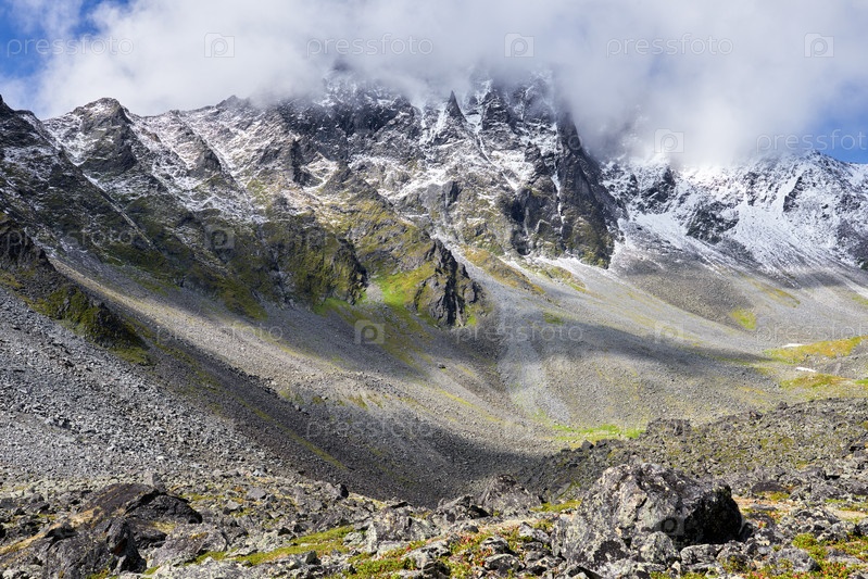 Вид на вершину горы, покрытую облаками. Альпийский пейзаж в Восточной Сибири. Россия