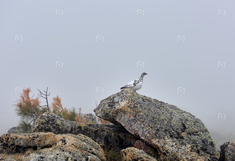 Скальная куропатка (Lagopus mutus montin) на фрагменте в туманной облачности