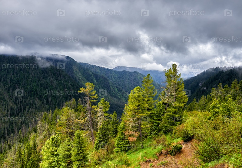 Участок леса на склоне горы, освещенный солнцем в пасмурную погоду