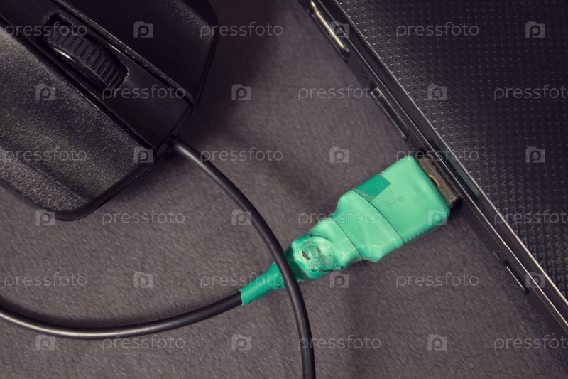 Фиксированный кабель USB-мышки, обернутый зеленой изоляцией и подключенный к порту ноутбука на черном фоне