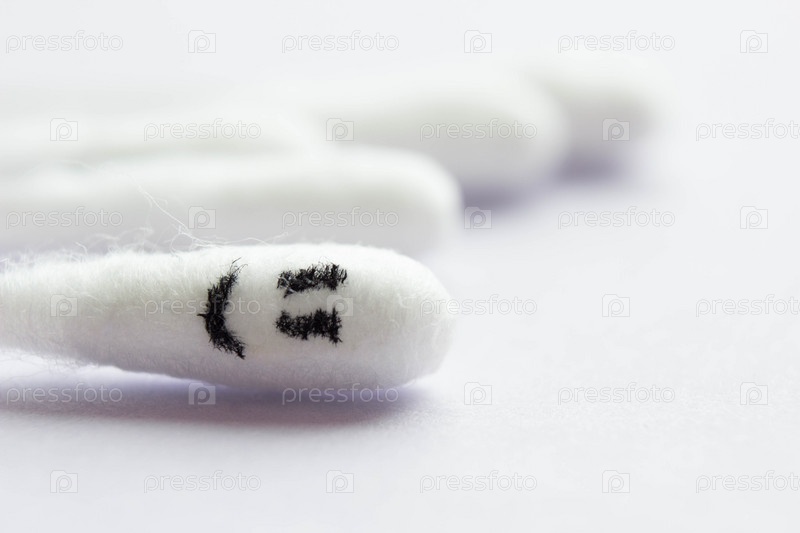 Крупный план ватных тампонов с улыбающимся смайликом на ватном тампоне на переднем плане. Концепция счастья