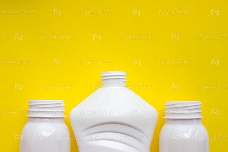 Белые пластиковые бутылки на желтом фоне с местом для вашего дизайна. Вид сверху