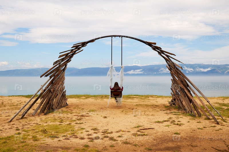 Деревянные деревенские качели на пляже острова Ольхон. Молодая девушка сидит на качелях