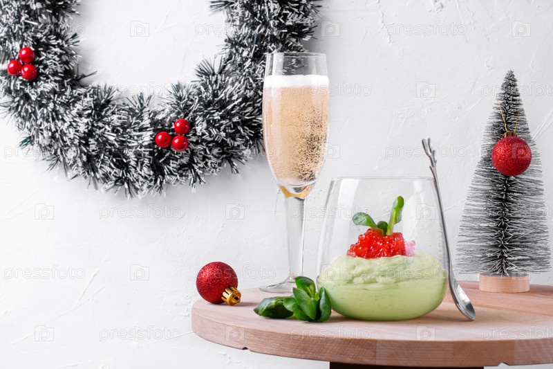 Мусс из авокадо со сметаной и красной икрой и бокал шампанского подается на деревянном столе и рождественских украшениях вокруг. Праздничная закуска. Сервировка новогоднего стола