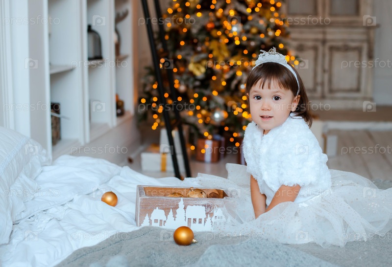 Маленькая девочка на фоне елки. Портрет счастливого ребенка в канун Рождества