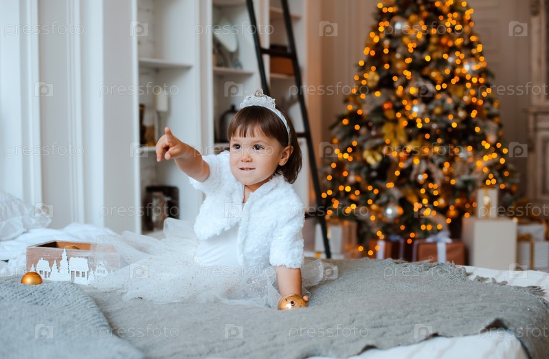 Маленькая девочка на фоне елки. Портрет счастливого ребенка в канун Рождества