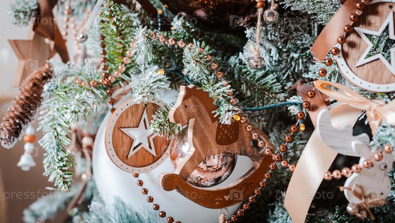Рождественский бал висит на украшенной елке на фоне горящих огней боке ночью