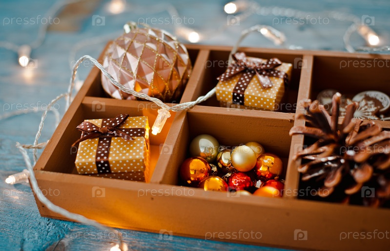 Рождественские украшения находятся в коробке на синем деревянном фоне