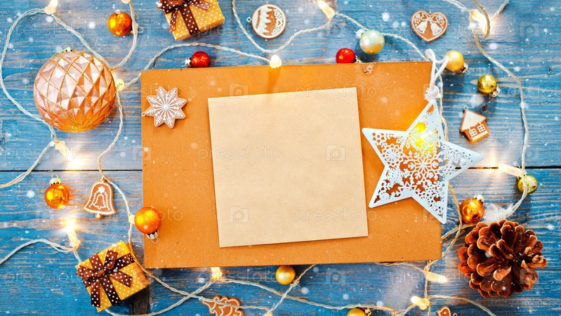 Новогодние украшения вокруг рождественского письма пустое место для текста горящие огни гирлянды на синем деревянном фоне
