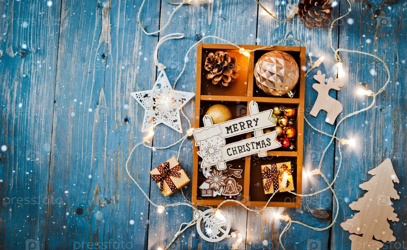 Рождественские украшения находятся в коробке на синем деревянном фоне