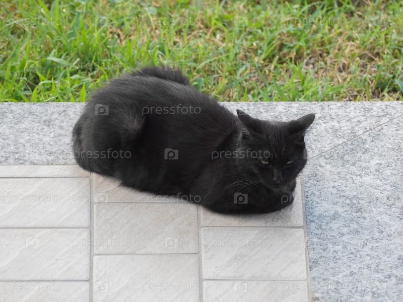 Черная кошка на тротуаре на фоне травы