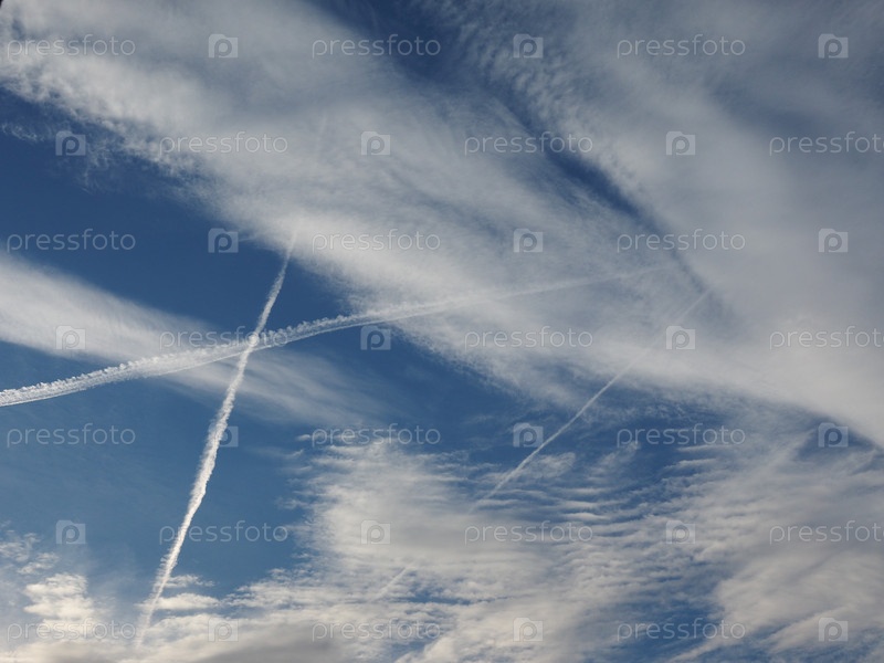 Голубое небо со следами паров самолетов (они же инверсионные следы, сокращенно от следов конденсации)