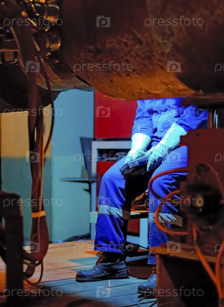 Сварщик отдыхает во время перерыва на работе