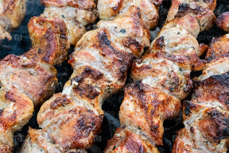 Жарка свинины на шампуре над мангалом. Переворачивание мяса над углями. Аппетитный шашлык