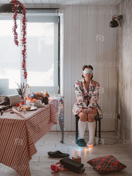 Молодая уставшая женщина сидит на стуле в пижаме и маске для сна в грязной комнате после новогодней вечеринки
