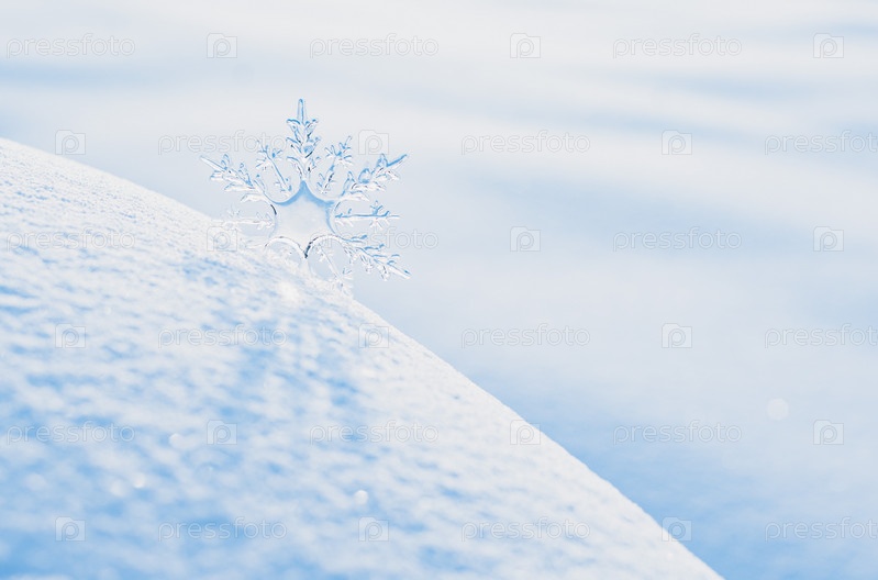 Красивый ледяной кристалл лежит в снегу и блестит на солнце, боке на синем фоне, рождественская открытка со свободным местом для текста