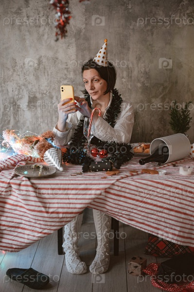 Усталая женщина делает селфи на мобильном телефоне, сидя за неубранным украшенным новогодним праздничным столом