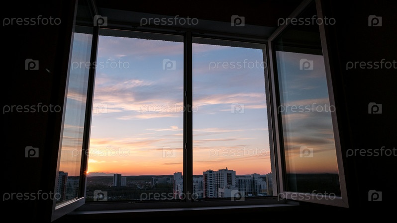 Закатные облака через окно с отражением в оконной раме