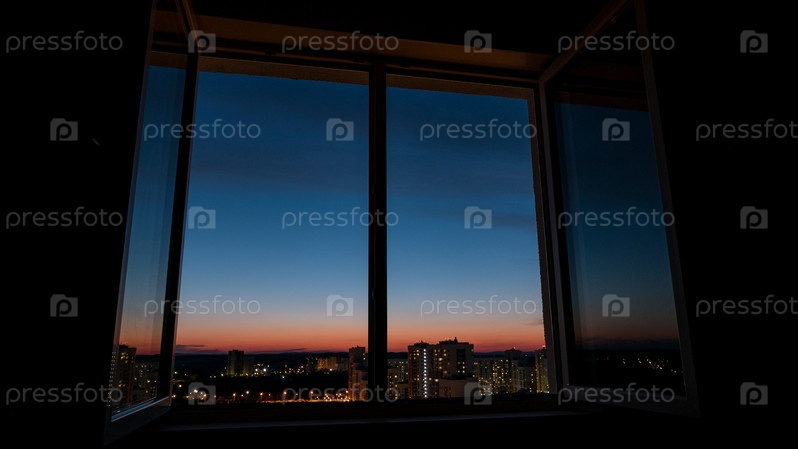 Закатные облака через окно с отражением в оконной раме