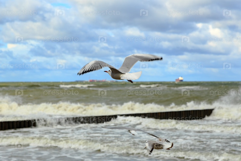 Россия, Зеленоградск. Чайка летит над пляжем. Балтийское море. Осень, большие волны на море