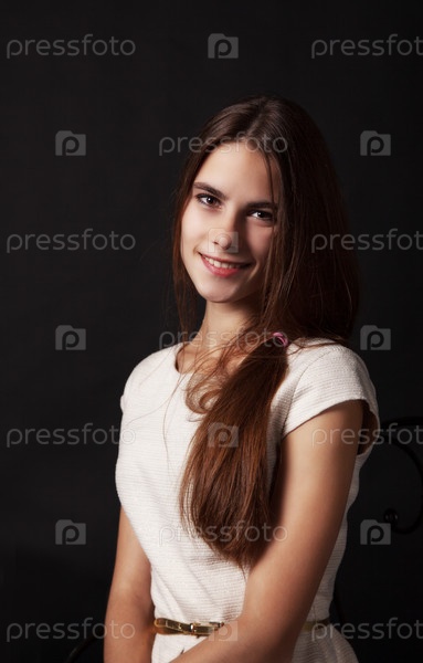 Портрет красивой молодой улыбающейся девушки в ярком платье