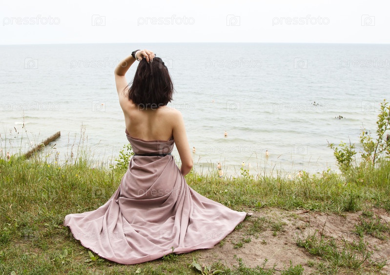 Молодая брюнетка в бежевом платье сидит у моря в летний день