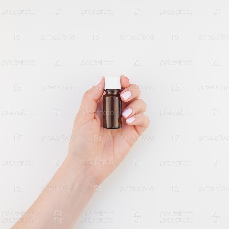 Женская рука с маленькой стеклянной бутылкой изолирована