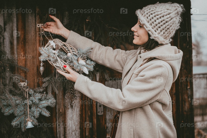 Праздничное украшение женщина создает атмосферу Рождества под открытым небом деревенский минималистичный современный из натуральных экологических материалов скандинавский стиль