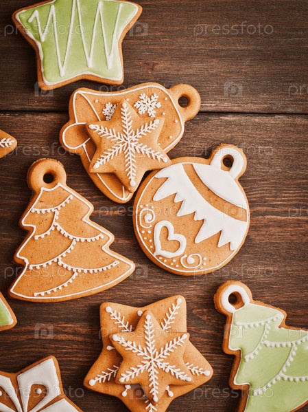 Праздничные рождественские пряники в форме звезды лежат на деревянном темно-коричневом фоне