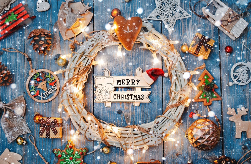 Новогодние украшения вокруг рождественского письма пустое место для текста горящие огни гирлянды на синем деревянном фоне. Вид сверху. Плоская укладка. копировать пространство коричневый деревенский стиль