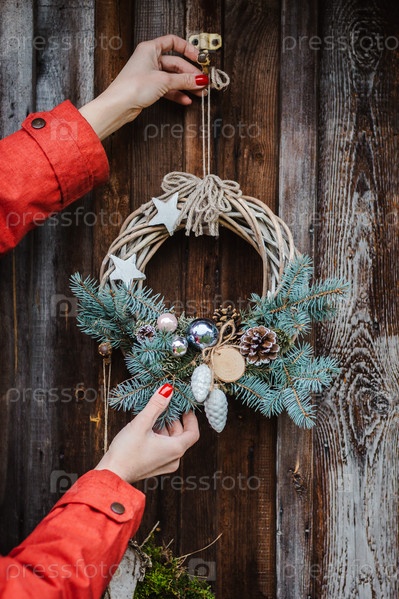 Вид сзади на молодых женщин-хипстеров, украшающих дом на Рождество у двери снаружи. Красивый венок рождественской елки на старом деревянном деревенском фоне