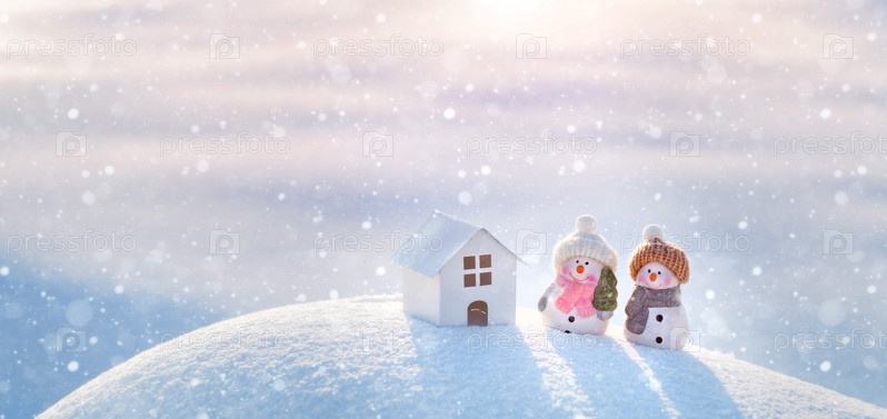 Поздравительная открытка с новым годом и Рождеством с космической копией. Счастливые двое нынешних мужчин, стоящих на рождественском пейзаже, солнечный зимний холм, небольшой дом. Снежный фон
