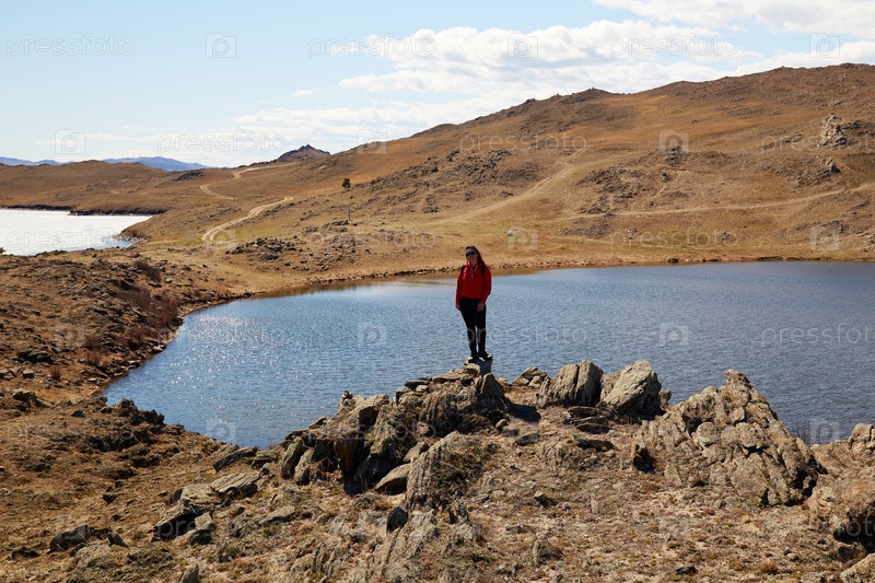 Озеро Байкал, остров Ольхон весной. Девушка смотрит на озеро Нуку-Нур или озеро Сердце. Путешествие в одиночку