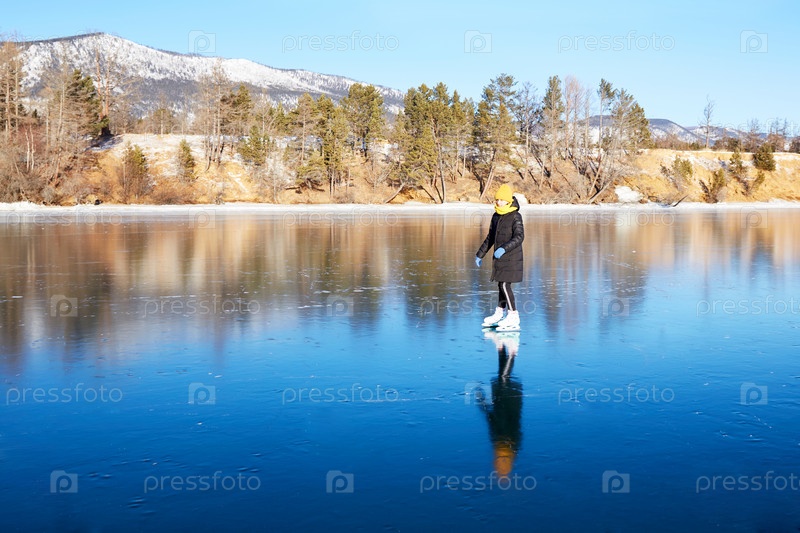 Молодая спортивная девушка катается на коньках по прозрачному льду замерзшего озера Байкал в солнечный зимний день