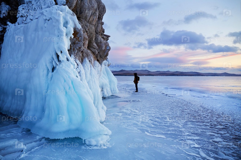 Озеро Байкал на закате. Человек путешествует по льду озера. Турист смотрит на сосульки на скалах