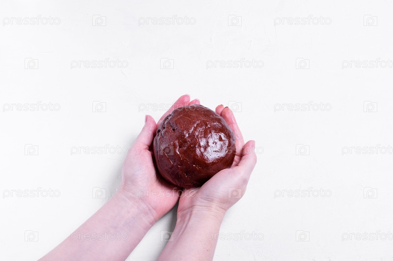 Шоколадное тесто в руках женщины на белом фоне. Готовим пирожное. Копировать пространство
