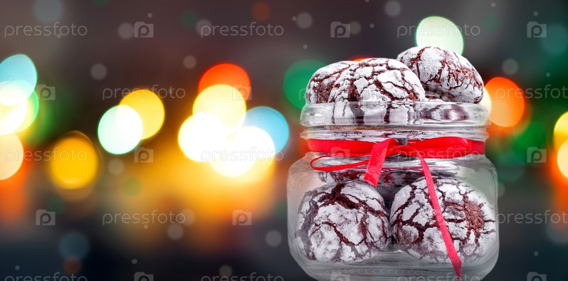 Шоколадное печенье в стеклянной банке с красной лентой на фоне размытых рождественских огней. Праздничный десерт